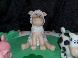 La torta per il primo compleanno del bambino di una mia amica è stata a tema animali visto che uno dei giochi preferiti di Franceschino è la fattoria. Ci è voluto un pò di tempo per realizzarla ma ne è valsa la pena. La torta era un pan di spagna alla vaniglia farcito con crema pasticcera e frutti di bosco. Si seguito i particolari del gatto, del maiale, della pecorella e della mucca.